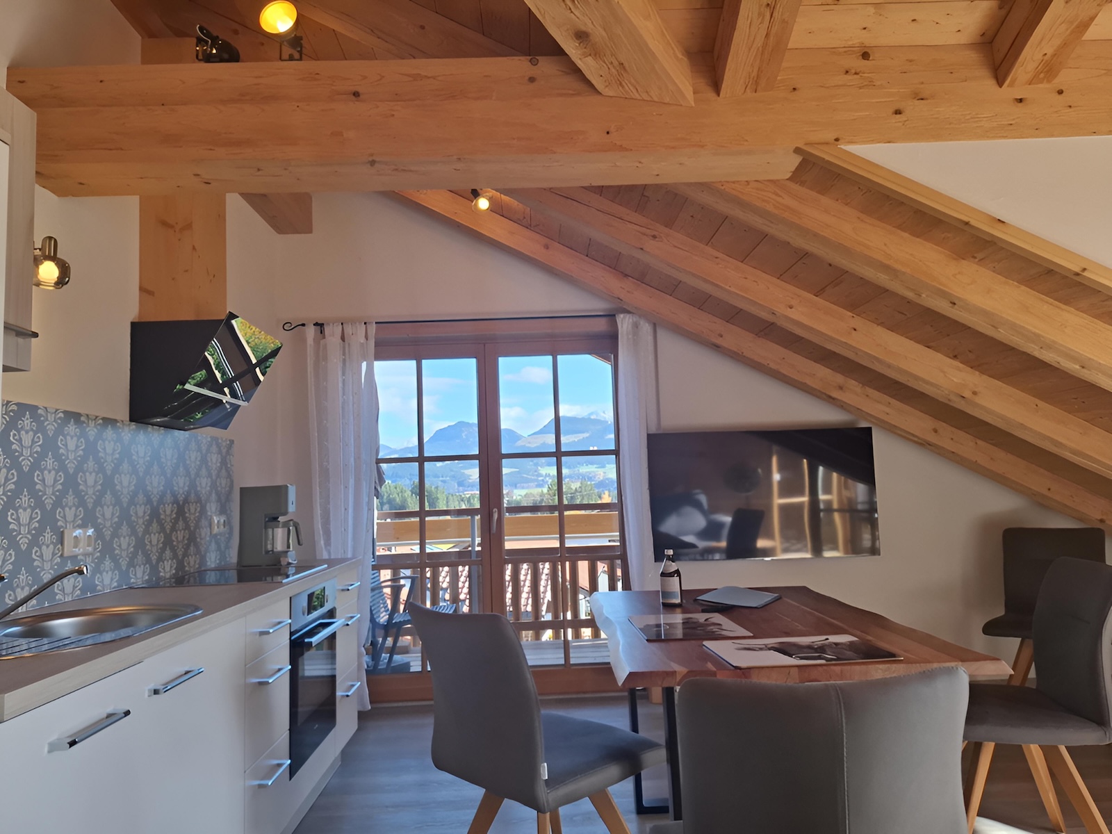 Durch die alpenländische Gestaltung erhält die helle Wohnküche ihren besonderen Charme, der zum gemütlichen Beisammensein einlädt.